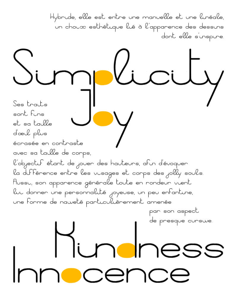 A hybrid, somewhere between a manual and a linear, an aesthetic choice linked to the appearance of the drawings from which it draws inspiration. Its features are thin and its x-height is more squashed in contrast to its point size, the objective being to play with heights, in order to evoke the difference between the faces and bodies of the jolly souls. Also, its general rounded appearance gives it a joyful, slightly childish personality, a form of “naivety” particularly brought about by its almost cursive appearance.